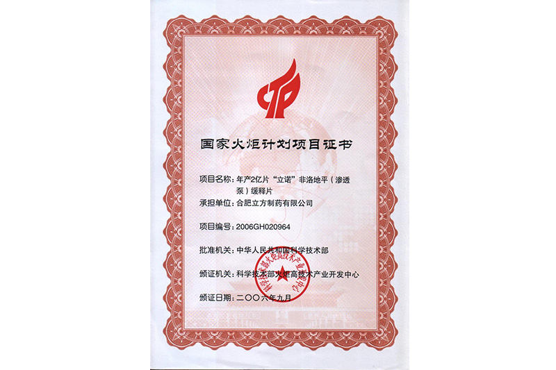 国家火炬计划项目证书